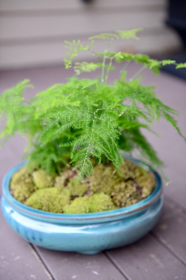 Moss and fern paired in a beautiful Bonsai pot..sure to put a smile on your face.
